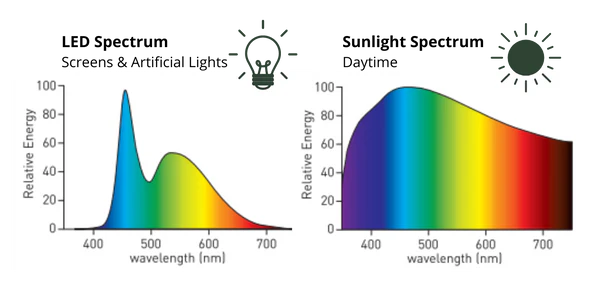 The common LED lighting found in most homes is bad for our health for two main reasons. It has a very high peak in the blue light range and very low peaks in the yellow, orange, and red colors. This high intensity of blue light sends erroneous information to our body, preventing our night cycle from properly activating, generating hormonal disruption (melatonin, cortisol, growth hormone, among others) and generating a chronic low-grade inflammatory environment. Aside from the eye damage caused by unnatural blue light, the possible effects it could have on skin blemishes and cancer have been studied in recent years. Keep in mind that the blue wavelength is located just after UV rays, so its intensity is very high. Since the standard LED light spectrum lacks red and IR (infrared) wavelengths, as we do with natural light, we are faced with highly inflammatory light waves without the other end of the spectrum, which is very anti-inflammatory.